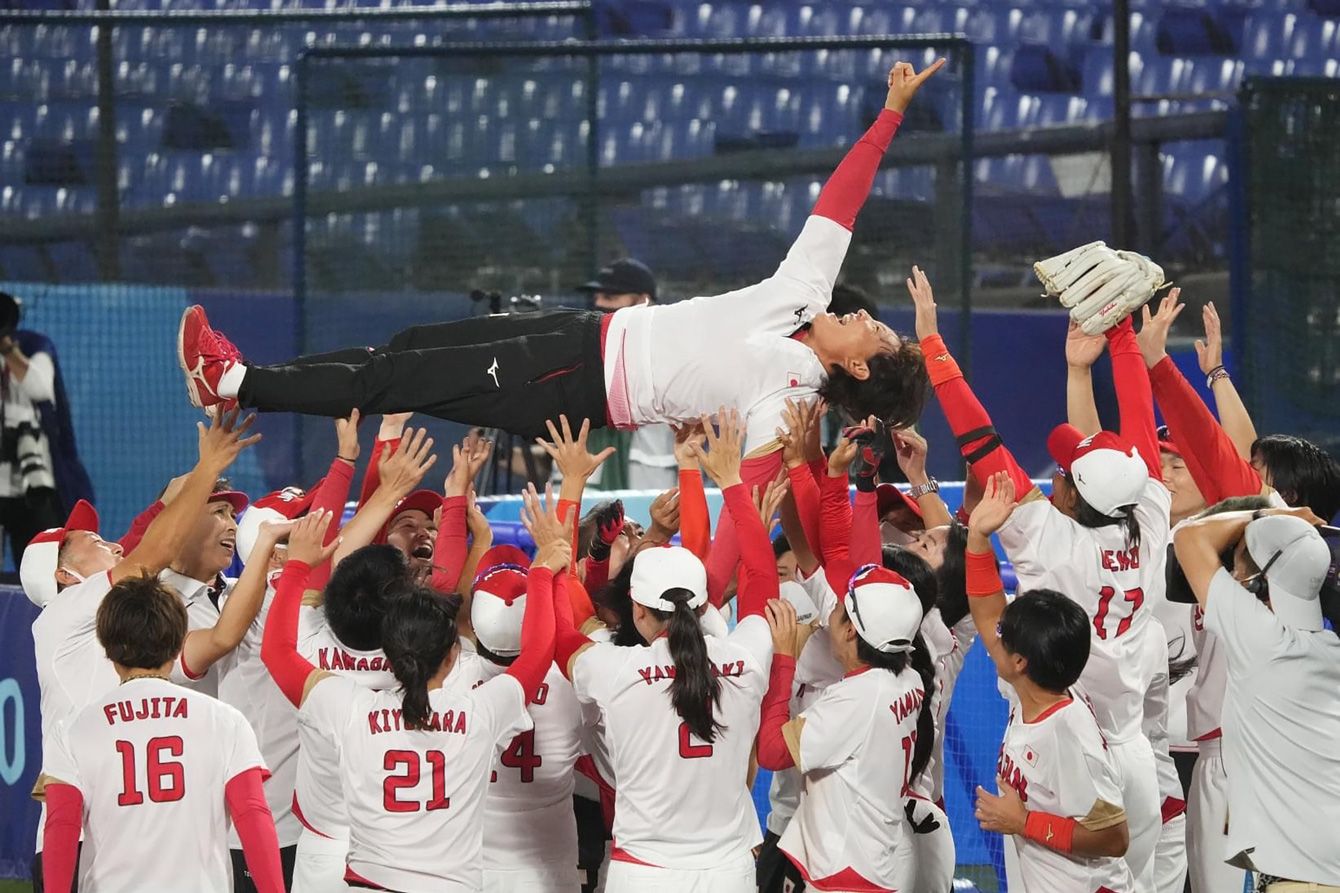 東京オリンピックで優勝を決め、選手たちに胴上げされる宇津木麗華監督。2021年7月27日、横浜スタジアムで
