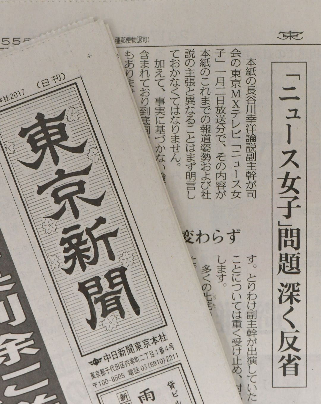 2017年2月2日の東京新聞朝刊一面に掲載された、東京MXテレビが1月に放送した「ニュース女子」についての記事。論説副主幹が同番組の司会を務めていた。東京MXテレビは番組の冒頭約20分間、沖縄県東村高江の米軍ヘリパッド建設への反対運動を取り上げた