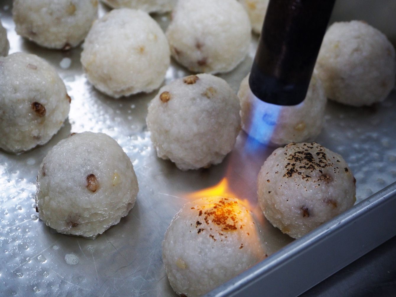 丸めたもち米をバーナーであぶる