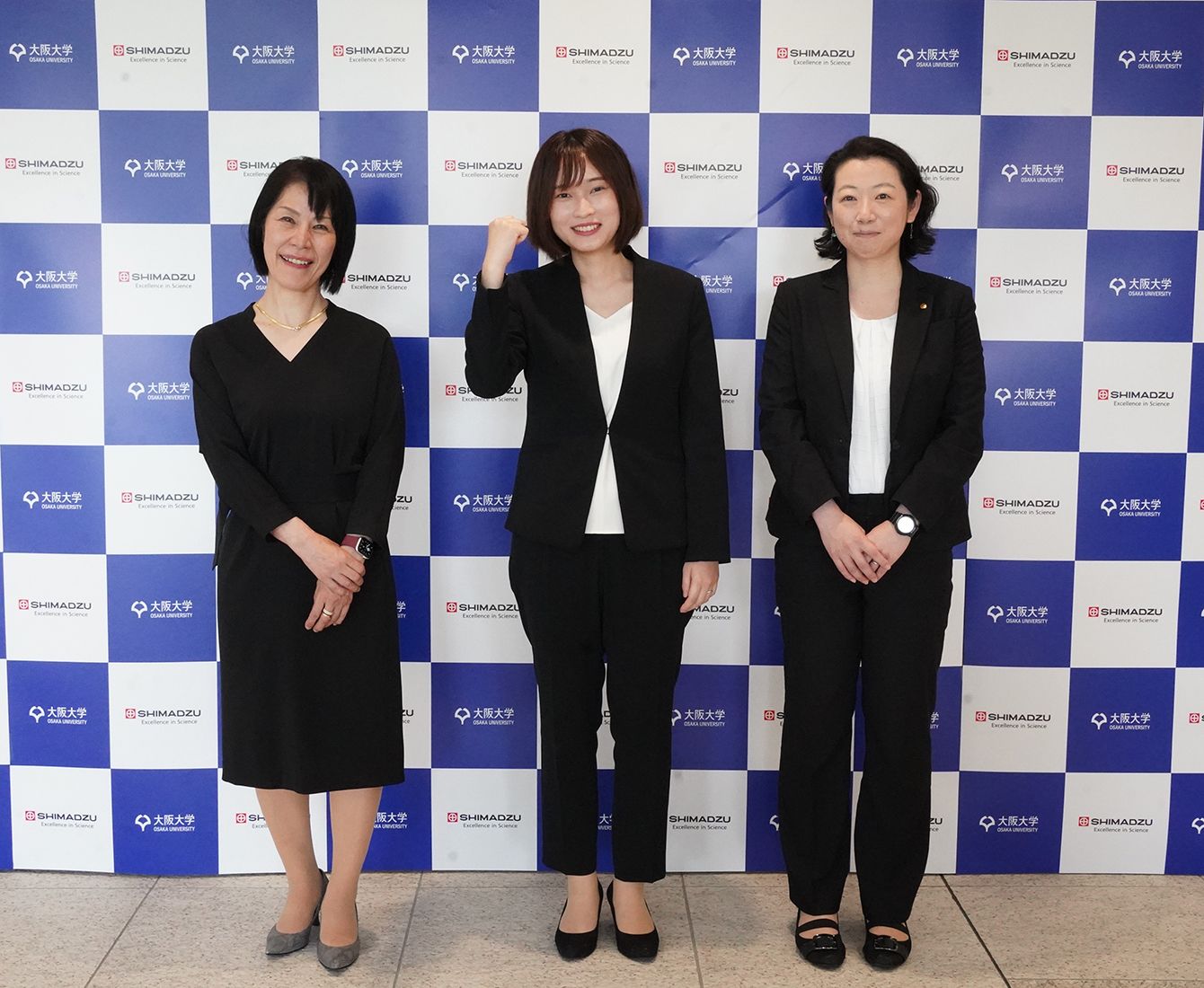 島津製作所上席理事、大阪大学工学研究科特任教授、大阪大学・島津分析イノベーション協働研究所所長 飯田順子さん(左)、人材開発室室長 妹崎淑恵さん(右)、分析計測事業部、大阪大学博士課程在籍林田桃香さん(中央)。(写真提供=島津製作所)