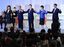 自民党総裁選を終え手を取り合う、(左から)野田聖子幹事長代行、菅義偉首相、岸田文雄新総裁、高市早苗前総務相、河野太郎規制改革担当相=2021年9月29日、東京都港区