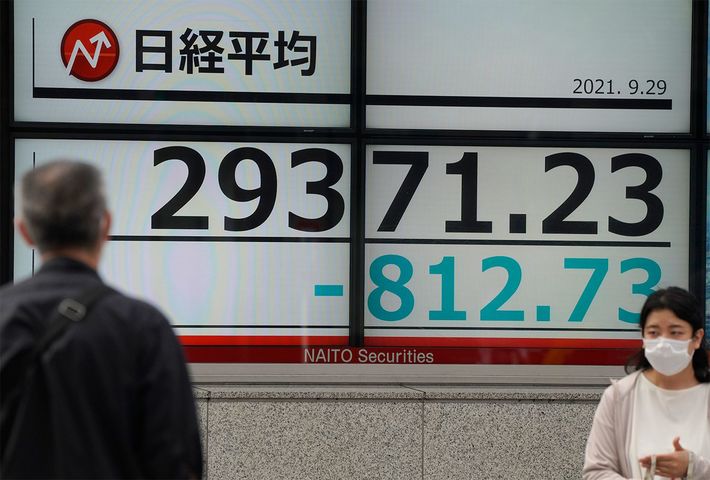 日経平均株価は米国の債務不履行の可能性を懸念してウォール街が569ポイント以上下落した後、639.67ポイント(2.12%)下落し、2万9544円29銭で終了した=2021年9月29日