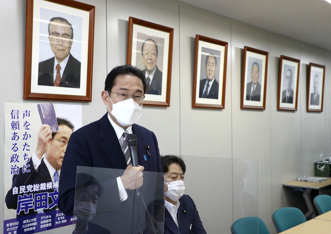 自民党岸田派(宏池会)の会合で発言する岸田文雄総裁(左)=2021年9月30日、東京・永田町[代表撮影]