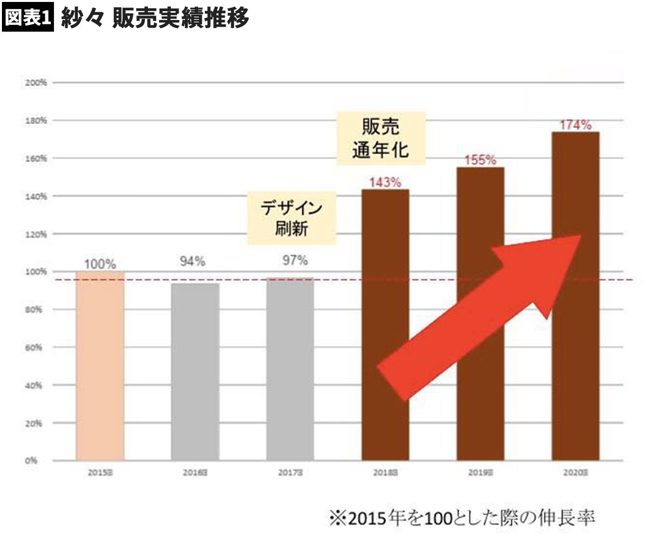 「紗々」の販売実績推移。2015年を100とした場合の伸長率