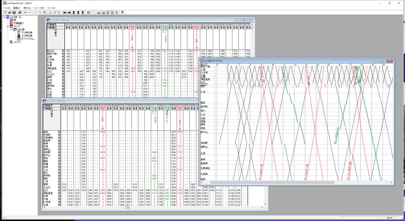 JR山口線の時刻表データを打ち込み、列車ダイヤですれ違いや追い越しを確認する(