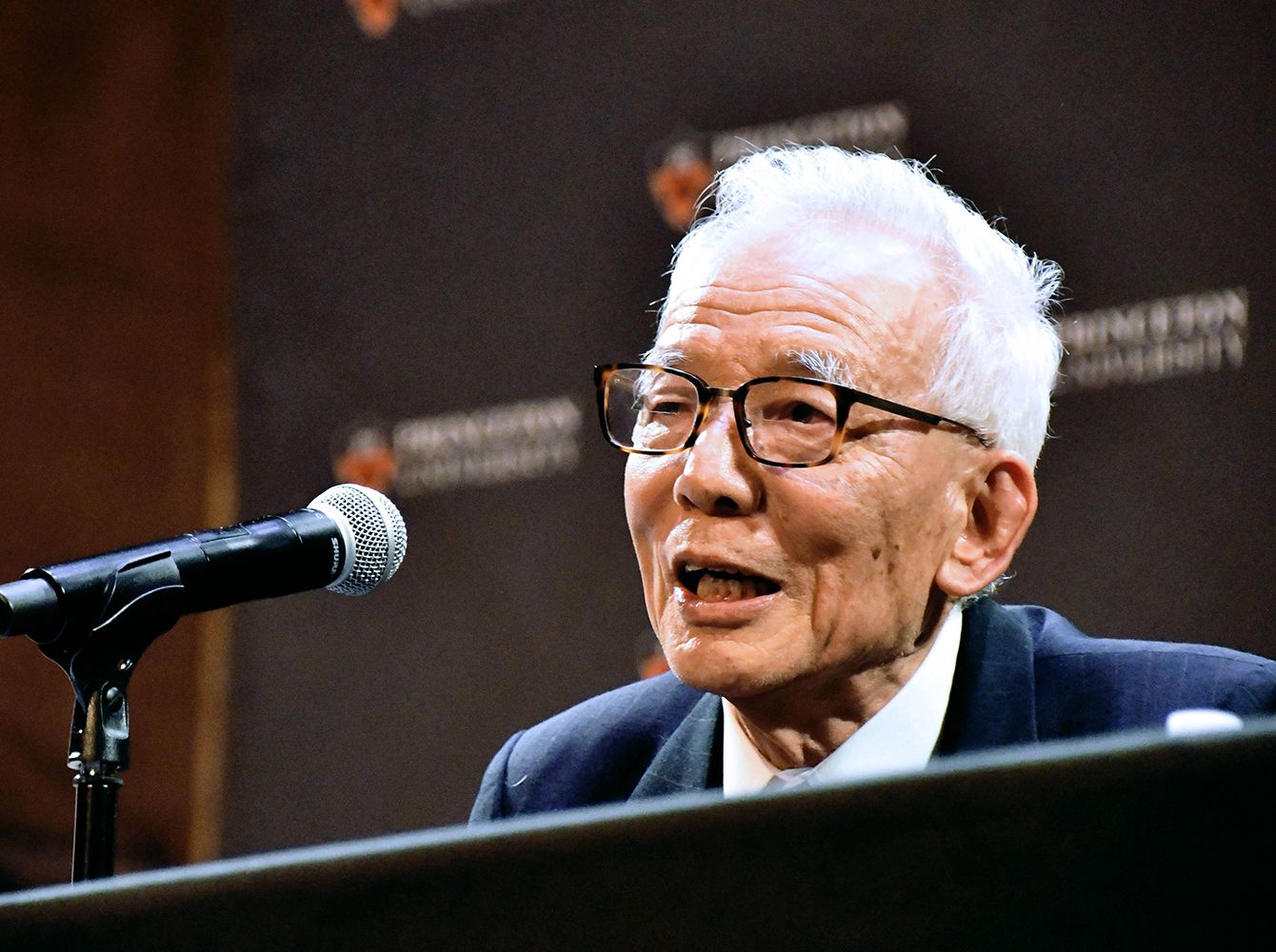 ノーベル物理学賞の受賞が決まり、プリンストン大で記者会見する真鍋淑郎上席研究員=2021年10月5日、アメリカ・ニュージャージー州