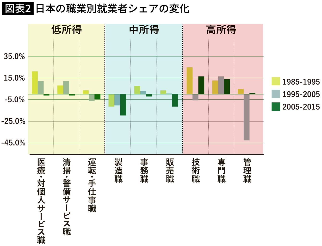 日本の職業別就業者シェアの変化。