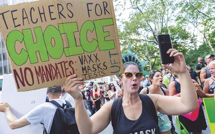 ワクチン接種などの義務化に抗議するデモ(米ニューヨーク)。(AP/アフロ=写真)