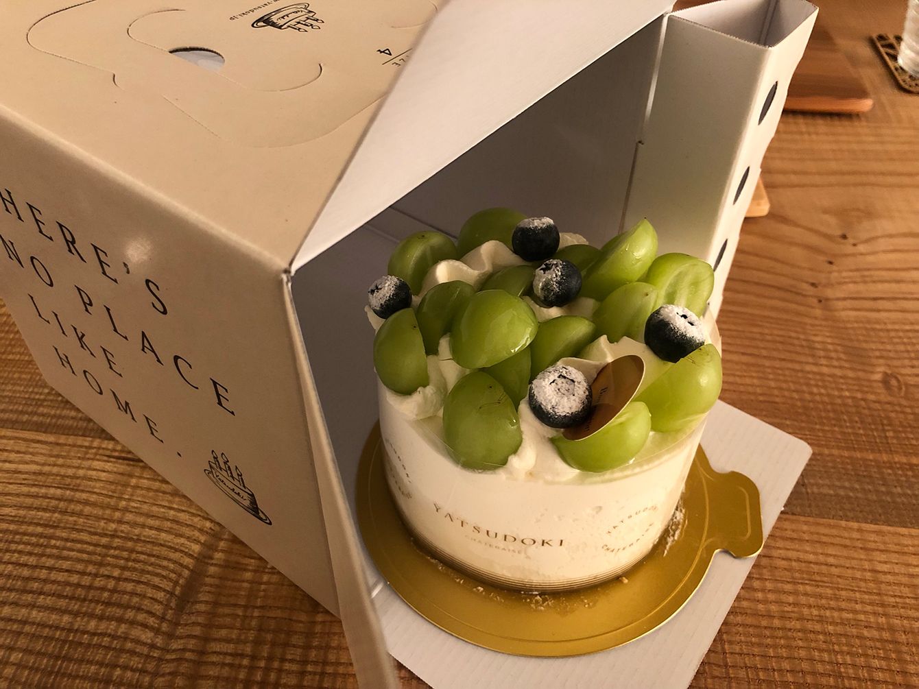 高級業態店であるYATSUDOKIのシャインマスカットをふだんに使ったホールケーキ。2600円でだいたい4人分くらいのサイズ