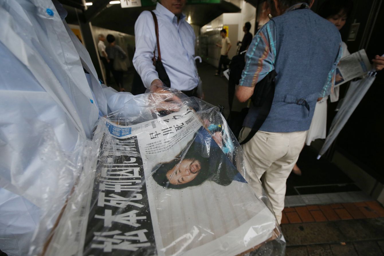 オウム真理教の元代表松本智津夫死刑囚らの刑執行を報じる号外=2018年7月6日、東京都港区