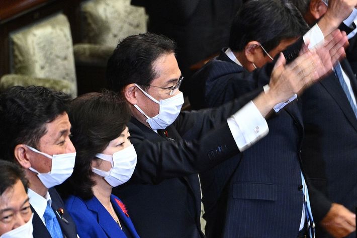 衆議院が解散し、拍手する岸田文雄首相=2021年10月14日、国会内