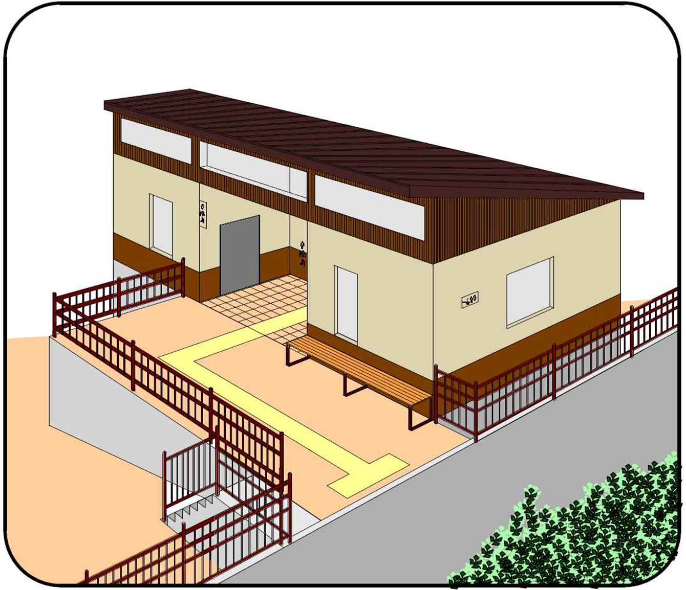 当初、市民投票で選ばれた公衆トイレのデザイン案。男性用が青色、女性用が赤色だった