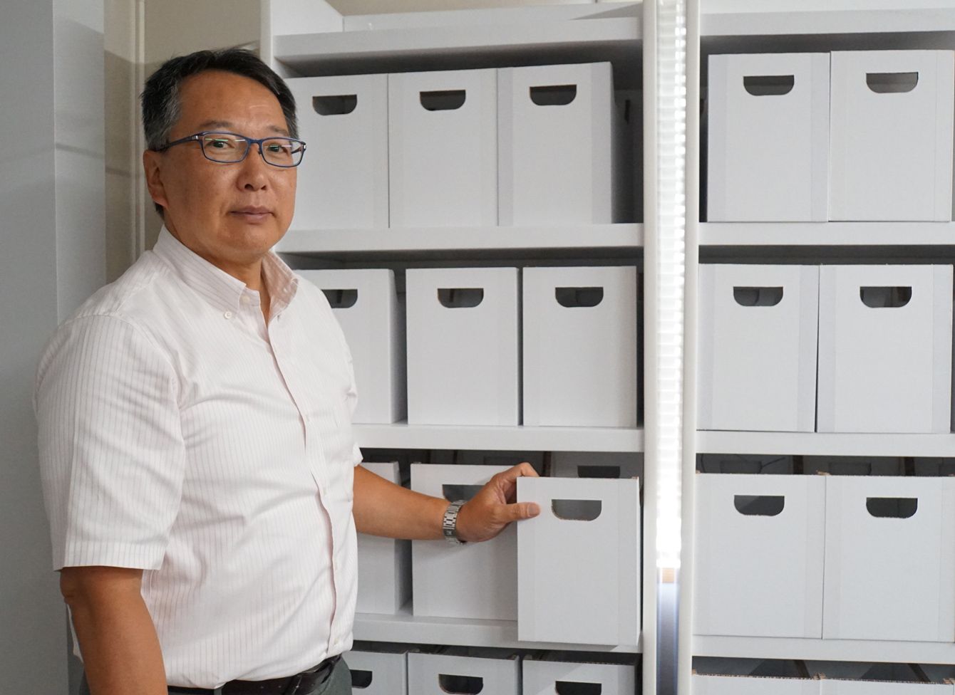 川口徹カワグチマック工業社長。段ボール製整理棚の前で