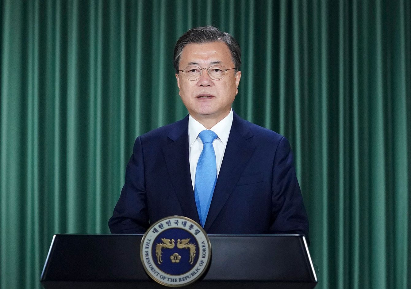 2021年10月12日、ソウルで開催された「アフガニスタンに関する仮想G20臨時首脳会議」で発言する文在寅大統領