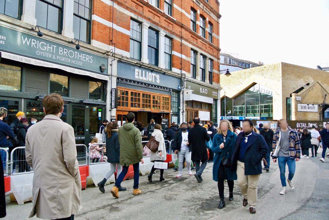 散歩や持ち帰り営業だけが許されていた昨年の厳しいロックダウン中の光景。ロンドンのフードマーケットは大にぎわいした観光スポットの一つ。