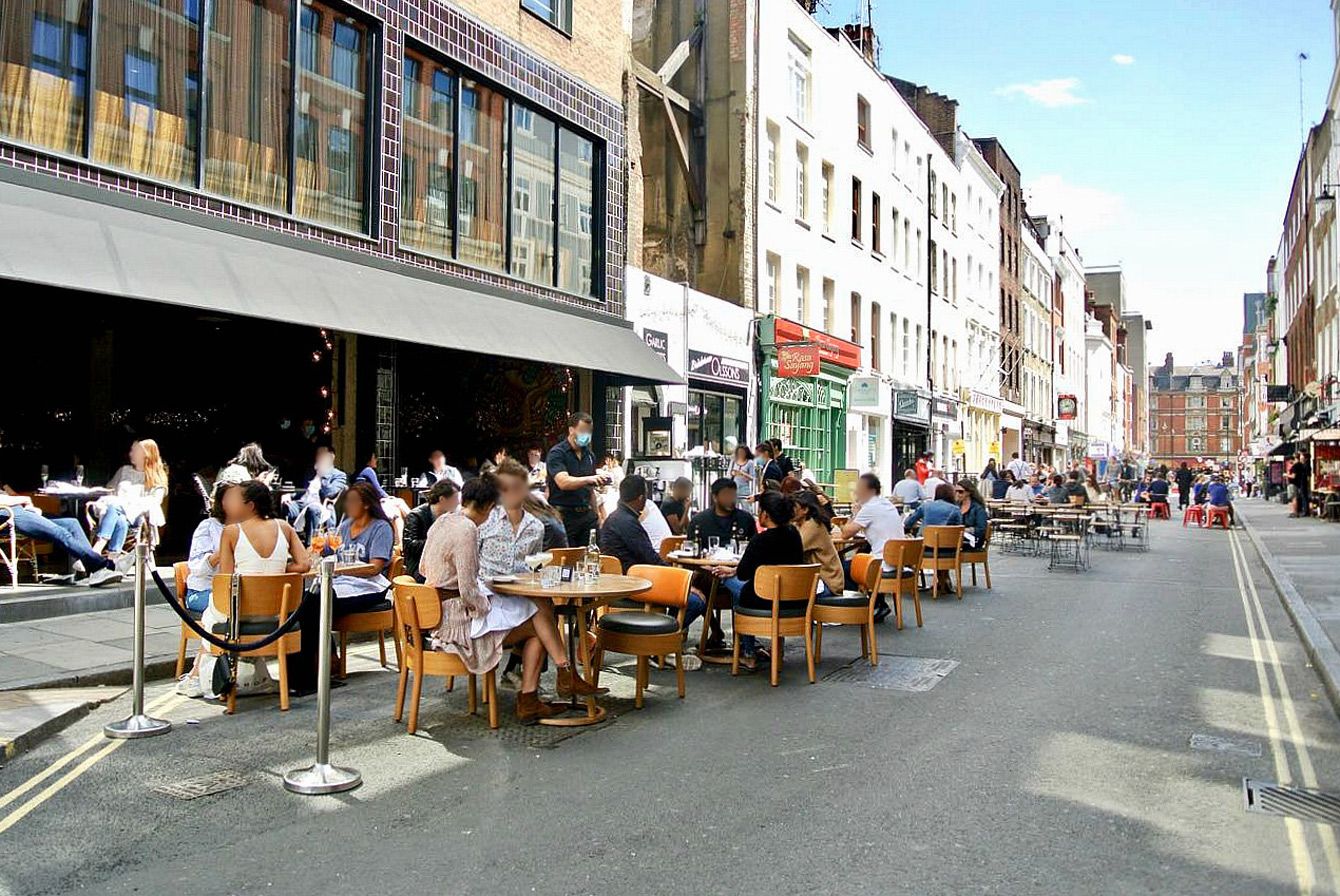ロンドンの繁華街に軒を連ねるレストランは、屋外営業の許可がおりるとすぐに夕方以降の路上営業の許可を地方自治体に申請。外食を待ちかねた人たちで大にぎわい。