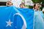 東京の在日中国大使館前で、新疆ウイグル自治区での騒乱事件について抗議する在日ウイグル人たち。掲げているのは東トルキスタン独立運動の旗=2009年7月8日