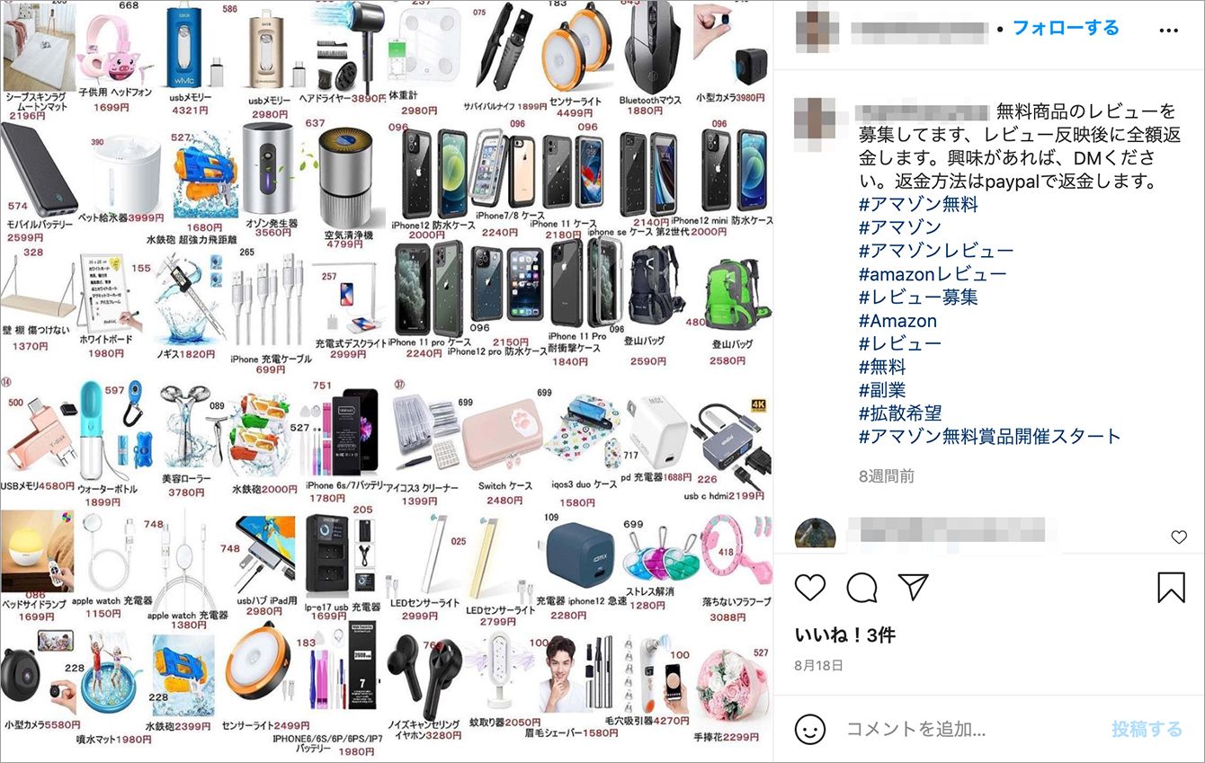 Instagram、Facebookで見つかるステマレビュー募集投稿