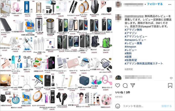 Instagram、Facebookで見つかるステマレビュー募集投稿(提供=高橋曉子)