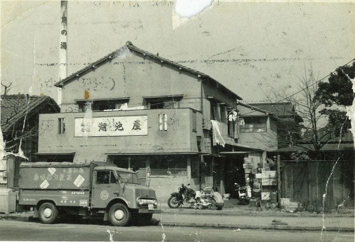 創業初期の湖池屋本社。手前に写っている乳母車の赤ちゃんが現会長