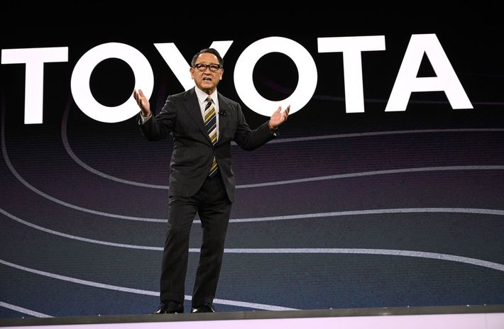 2020年1月6日、米国ネバダ州ラスベガスで開催された2020年CESのトヨタプレスカンファレンスで講演するトヨタ自動車の豊田章男社長兼CEO。