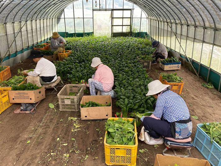 小松菜を収穫する従業員の女性たち