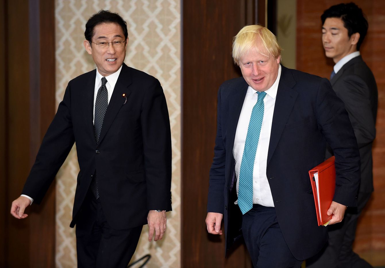 2017年7月21日、東京・飯倉公館で、岸田文雄外相(当時)の歓迎を受けるボリス・ジョンソン英国外務・英連邦大臣(当時)