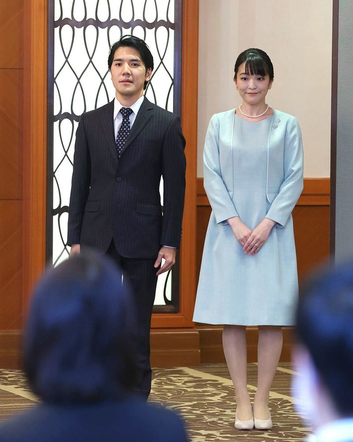 結婚の記者会見を終え、退席する小室圭さん(左)と眞子さん=2021年10月26日午後、東京都千代田区[代表撮影](写真=時事通信フォト)