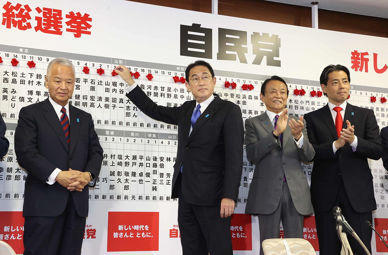 当選確実の候補者名に花を付ける岸田文雄首相(左から2人目、自民党総裁)。左端は甘利明幹事長=2021年10月31日、東京都千代田区