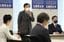 立憲民主党の執行役員会で辞任の意向を表明する枝野幸男代表(奥左)。同右は福山哲郎幹事長=2021年11月2日、衆院議員会館