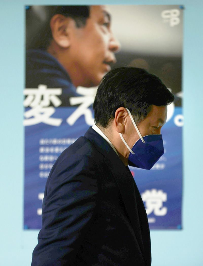 記者会見を終えた立憲民主党の枝野幸男代表=2021年11月1日未明、東京都港区(写真=時事通信フォト )