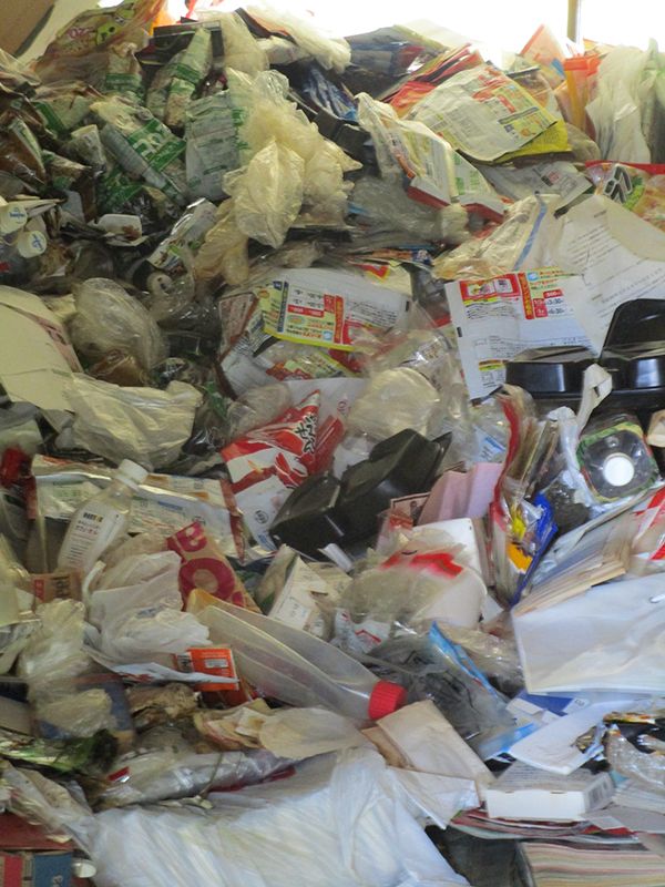 こうしたゴミがエアコンの高さまで積み上がっていた。この日はあまりの暑さのため、連続した作業は10分が限界だった。(撮影=笹井恵里子)