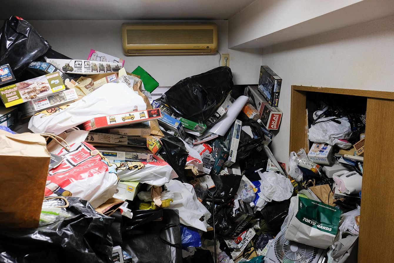 リビングの様子。やはりエアコンの高さまでゴミが積み上がっていた。撮影までに片づけが進んでおり、当初は隣の部屋には入れなかった。エアコンのリモコンはのちほどゴミの中から見つかった。