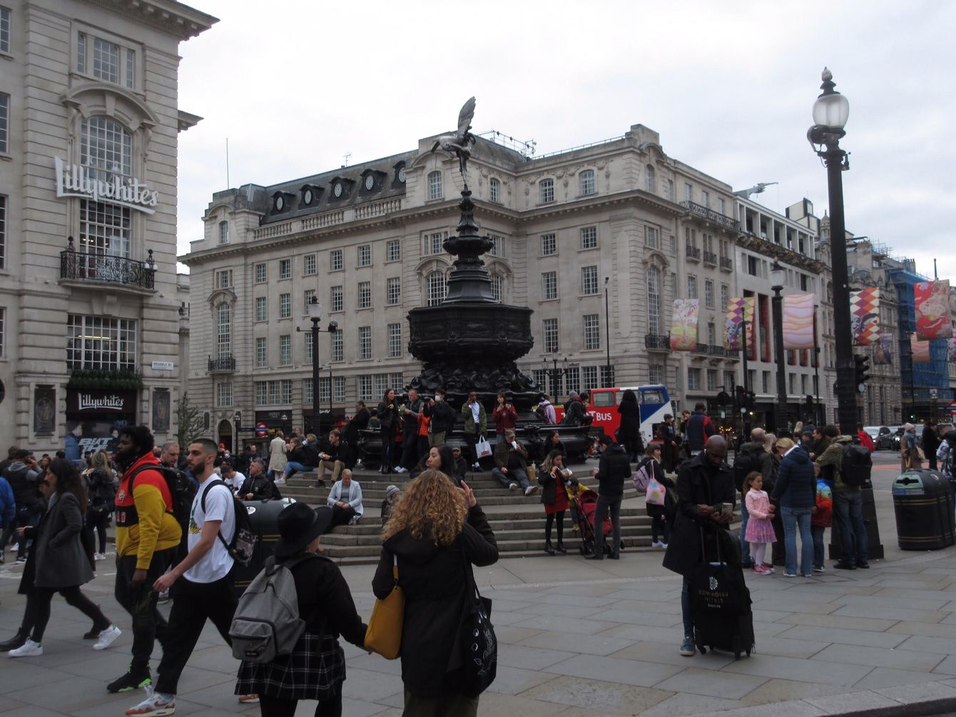 ロンドン中心部・ピカデリーサーカス。マスクをしている人はほとんど見かけない