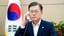 韓国の文在寅大統領がソウルの事務所で日本の菅義偉首相と電話で話をしている様子=2020年9月24日