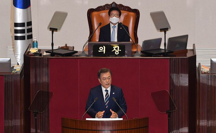2020年7月16日、韓国の文在寅大統領が韓国・ソウルで第21回国会の開会式で演説