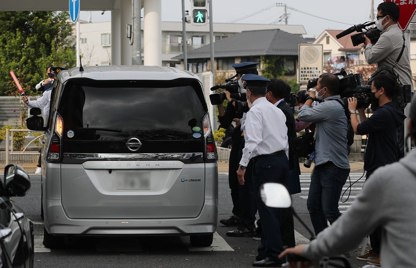 京王線車内での無差別刺傷事件の容疑者を送検するため、警視庁調布署を出た車両=2021年11月2日、東京都調布市
