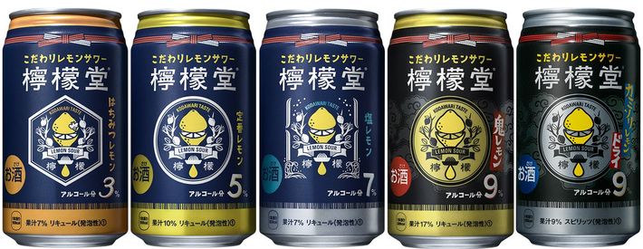 アルコール分3%のはちみつレモン、5%の定番レモン、7%の塩レモン、9%の鬼レモンとカミソリレモンの5種類を展開。