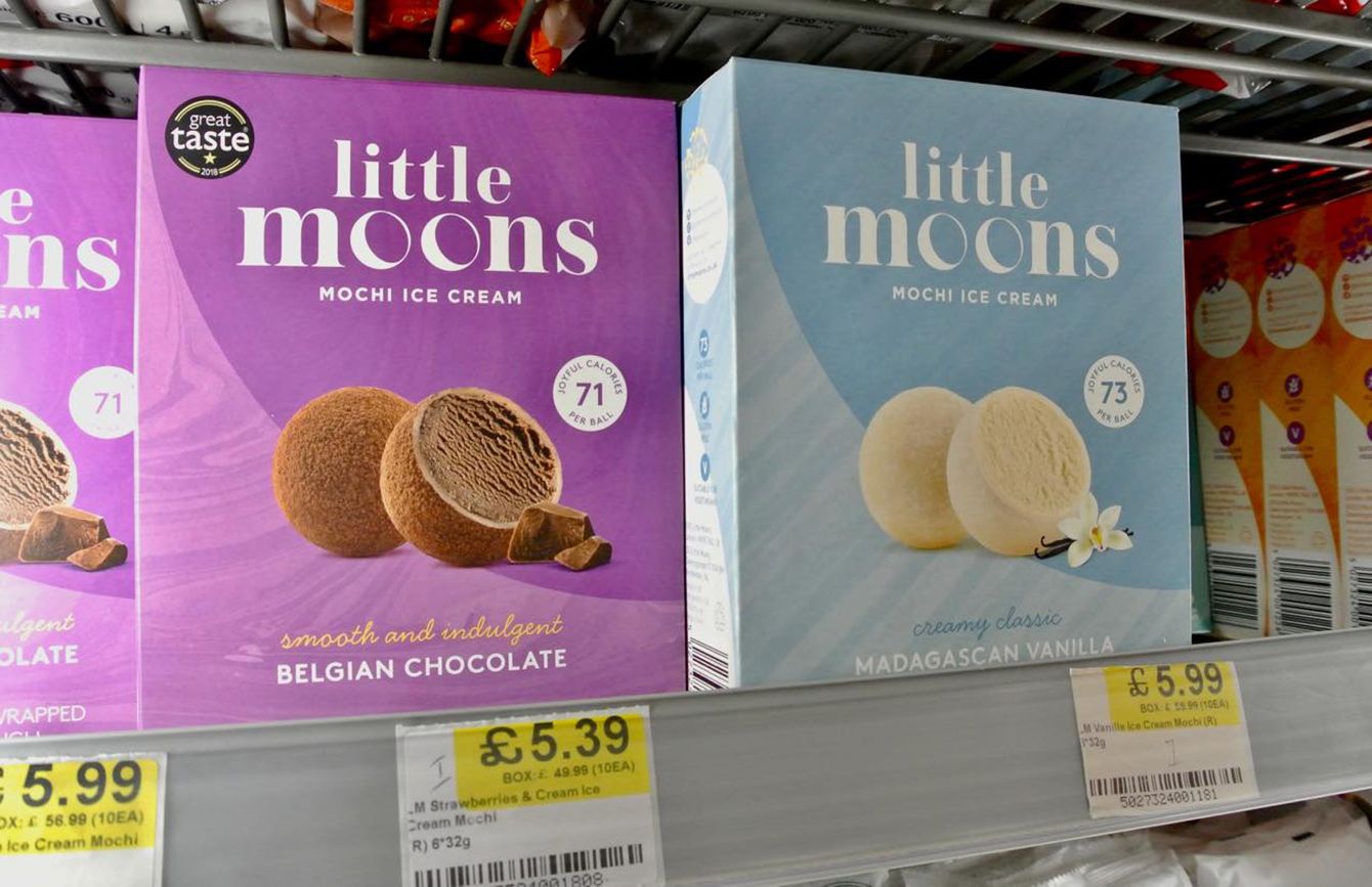 アジア系の簡易スーパーの棚に収まるLittle Moonsの商品。