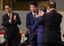 両院議員総会で菅義偉官房長官から花束を受け取る安倍晋三首相(左から2人目)。右端は石破茂元幹事長、左端は岸田文雄政調会長=2020年9月14日午後、東京都港区(肩書はすべて当時)