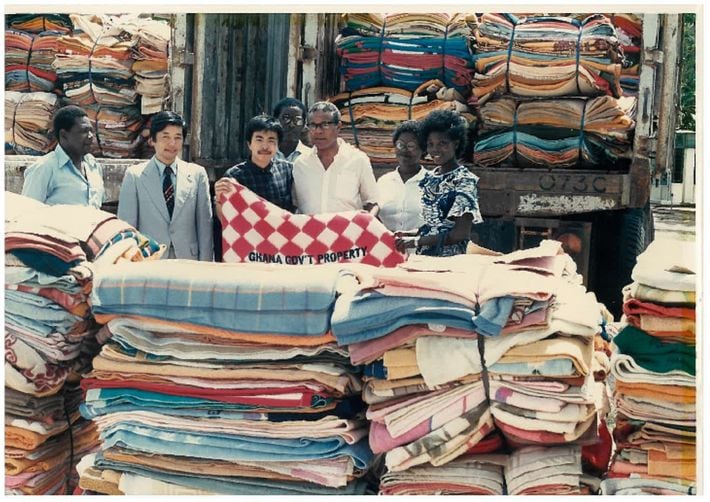 1985年、ガーナで毛布の支援活動をする中川さん(左から3番目)