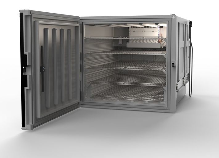 ワクチン冷蔵輸送車の内部。ワクチン専用の冷蔵庫が車載してある