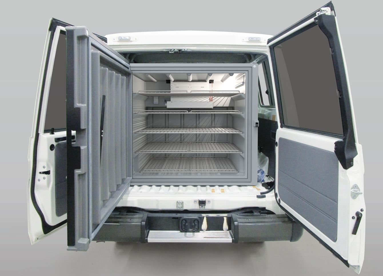ワクチン冷蔵輸送車の内部。ワクチン専用の冷蔵庫が車載してある
