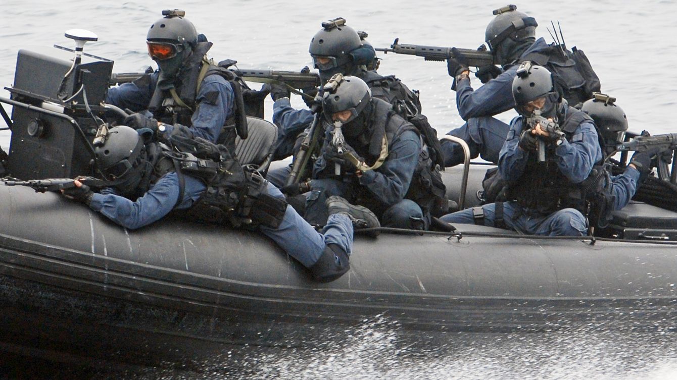 高速ボート(特別機動船)から銃器をかまえ、不審船の警戒にあたる訓練をする特別警備隊(広島湾、2007年6月28日)
