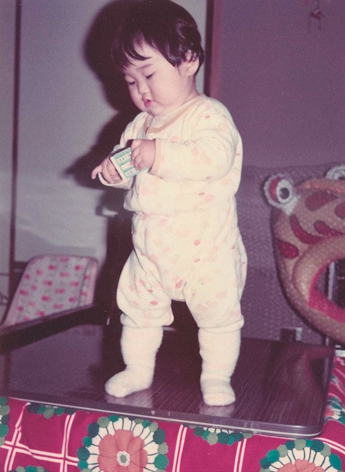 こたつの上に立つエリーさん。1歳くらいの頃。