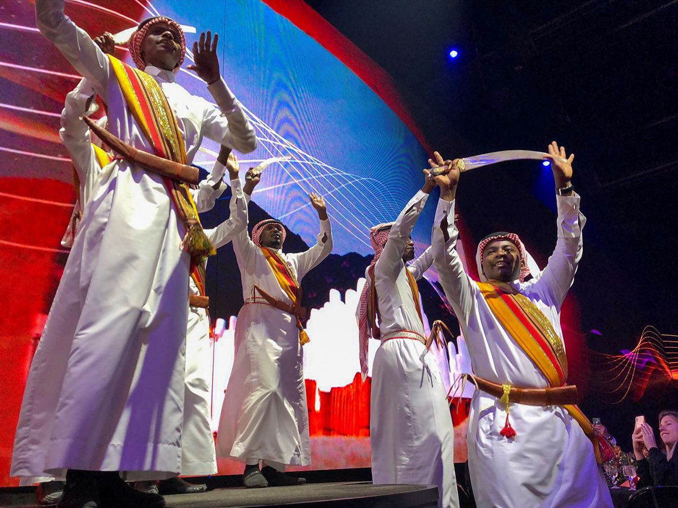 2019年9月27日、サウジアラビアのリヤドにある歴史的なディリヤで行われた夕食会で、新しい観光ビザ制度の発表の際に、サウジアラビアのダンサーがパフォーマンスを行った。REUTERS/Stephen Kalin(サウジアラビア)