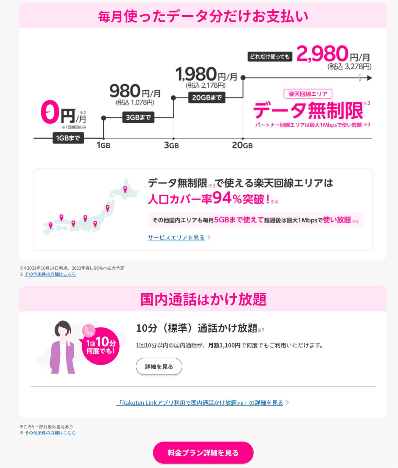 現在の楽天モバイルトップページのページ下部。<「Rakuten Linkアプリ利用で国内通話かけ放題」の詳細を見る>の文字は小さい(画像=