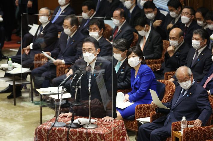 衆院予算委員会で答弁する岸田文雄首相(中央)=2021年12月13日、国会内