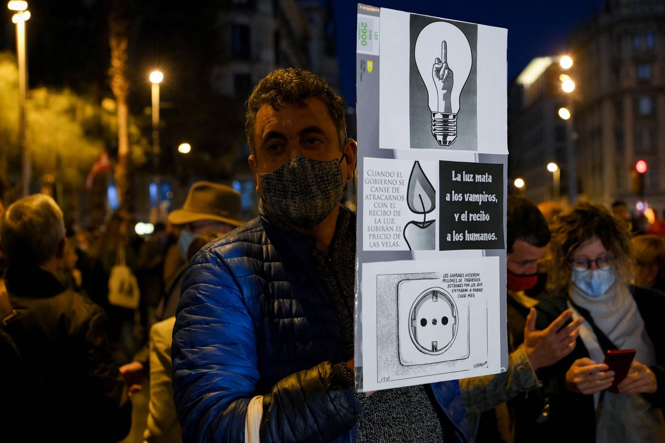 2021年11月6日、バルセロナで行われた電気料金の高騰に対する抗議デモで、「光は吸血鬼を殺し、法案は人間を殺す」と書かれた看板を掲げるデモ参加者
