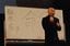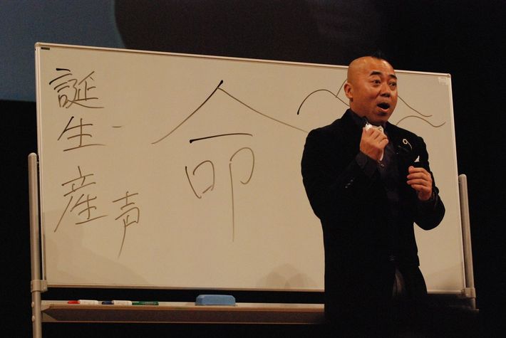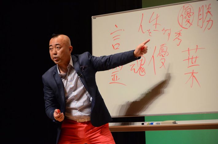 講演会での一幕。漢字の意味からメッセージを伝えている。